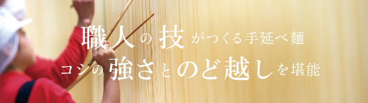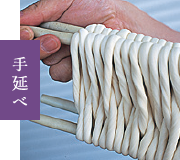 - 手延べ製法は、生地をひたすら一定方向に延ばして細い紐状にしていきます。この延ばしと熟成を繰り返し、延ばすと同時に撚り(より)をかけながら麺状にすることで、麺棒で伸ばしてつくる手打ちにはない、手延べ独特のコシの強さが生まれます。そして、刃物を使わないので断面が丸くなり、のど越しも良くなります。