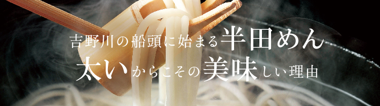半田そうめんは江戸時代からの歴史があり、三百年余前に吉野川の船頭が運搬の少ない冬場の仕事として、奈良の三輪地区から技術を持ち込んだのが始まりといわれています。吉野川を上下する平田船により、原料の小麦粉、塩、油を手に入れることは簡単でした。半田は平らな土地が狭く、傾斜地が大部分を占めていたので農産物には適しない地形でしたが、県内を東西に流れる清流吉野川の伏流水、標高千メートル以上の山々が連なる四国山脈から吹き降ろす冷風という自然条件が整っていたため、全国で有数の手延べそうめんの産地になりました。