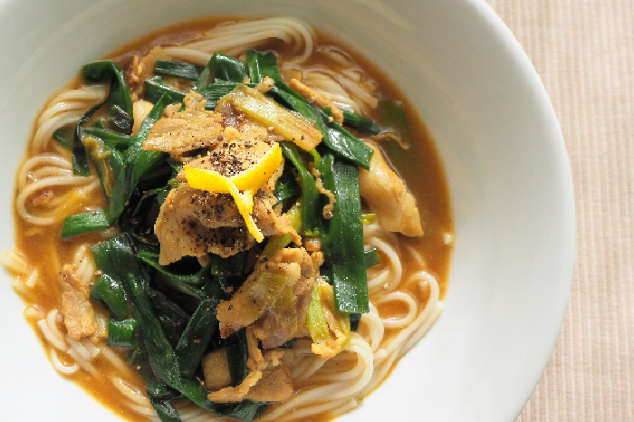 豚肉の旨みとしょうがの効いたつゆが、半田めんとも相性ばっちりです。