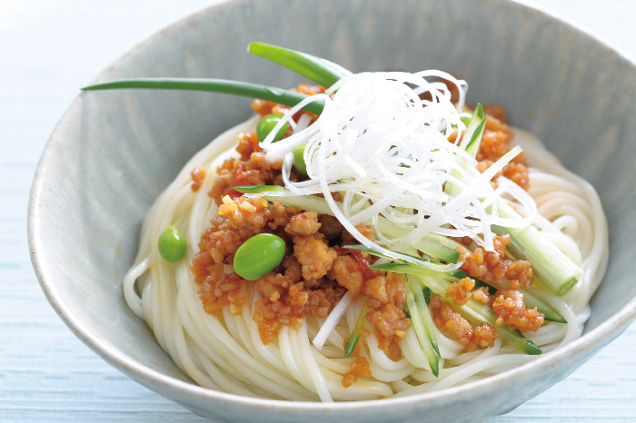 ピリ辛の肉みそを半田めん(半田そうめん)にからめていただく中華風のアレンジレシピです。
