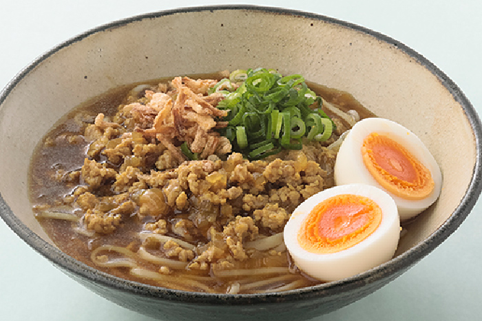 - 茹でた「半田めん」に熱湯をかけて温めたら、湯をきって器に盛り付けます。2をかけ、ゆで卵、ねぎ、フライドオニオンをのせたら完成です。