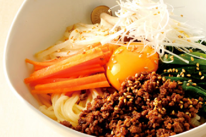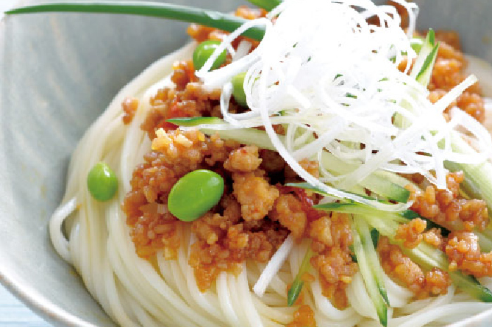 ピリ辛の肉みそがのど越しのよい半田めんによく合うレシピです。キュウリや白髪ねぎを添えることでボリュームもあります。