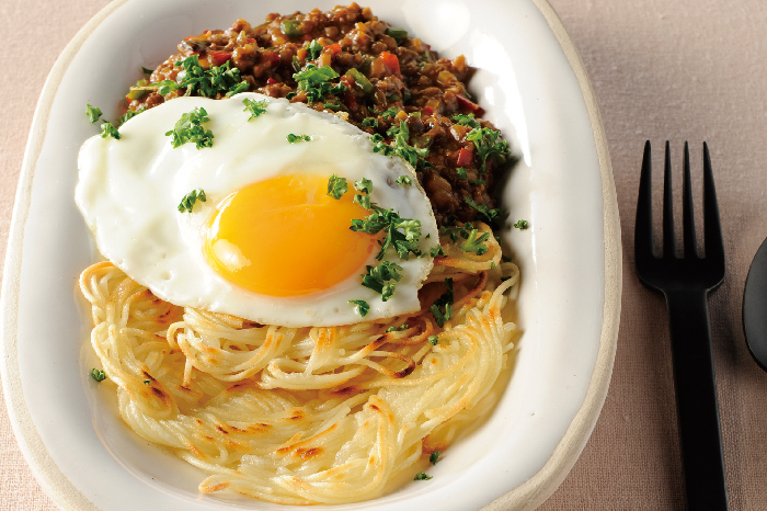 野菜がたっぷりのキーマカレーをカリッと焼いた半田めんにかけていただくレシピです。