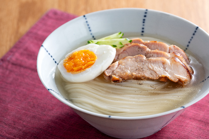 - 3のスープを半田めんにかけ、鶏もも肉、ゆで卵、きゅうりを盛り付けます。塩加減はお好みで足して、お召し上がりください。
