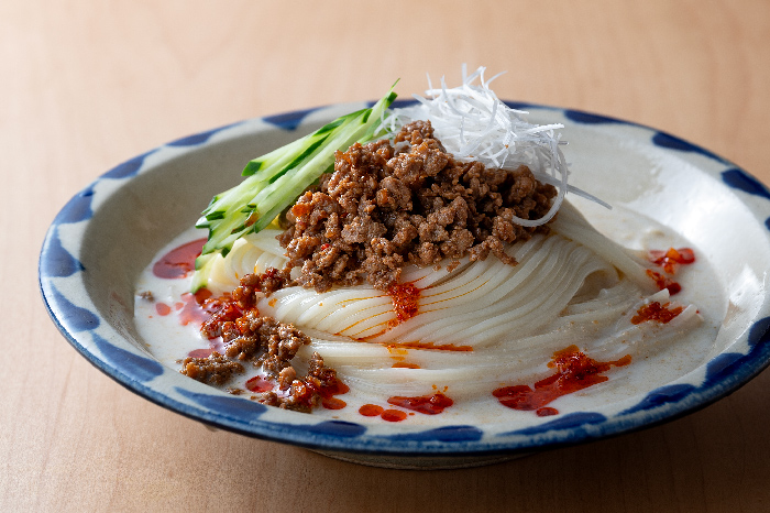 豆乳とねりごまのまろやかな冷製スープに、ピリ辛の肉そぼろをトッピングした、クセになる味わいの担々風そうめん。