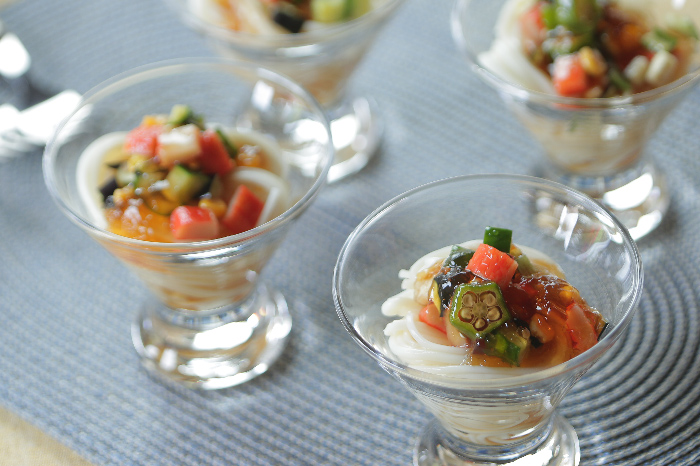 硝子の器に小さくわけた半田めん(半田そうめん)の上に、夏野菜ジュレをトッピング。