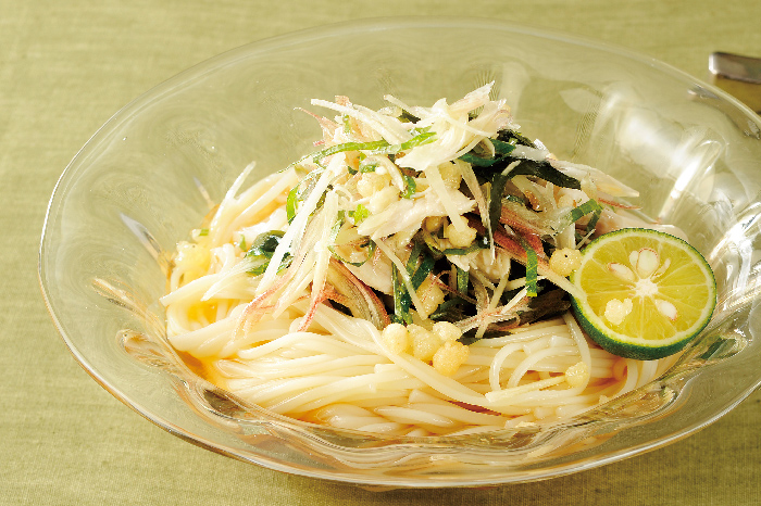 みょうがや生姜、青じそといった香味野菜をふんだんに使った、爽やかな香りが広がる冷やしそうめん。