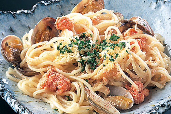 ニンニクとオリーブの香りが食欲をそそり、たらことパセリの彩りもきれいな一品です。