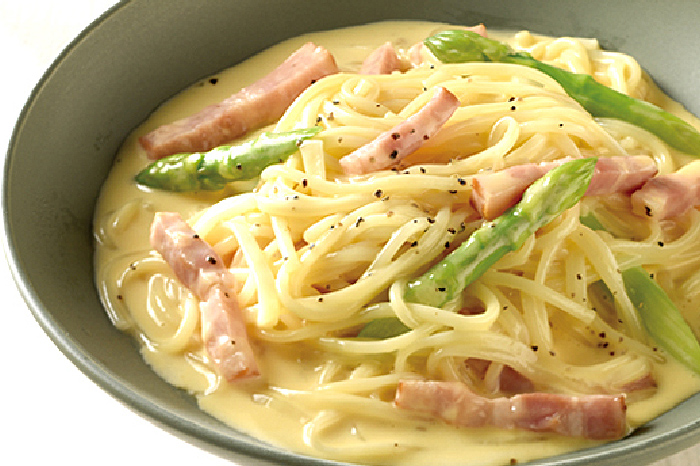 子どもも大好きなチーズやクリームを使い、半田めんをカルボナーラ風に仕上げた一品です。