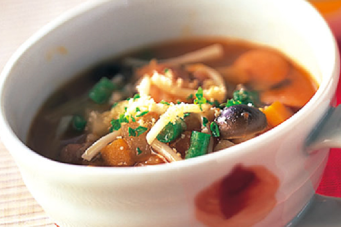 野菜たっぷりで身体に優しいミネストローネに、半田めんを乾麺のまま加えるお手軽レシピです。