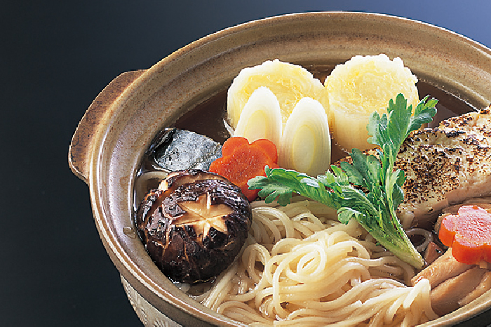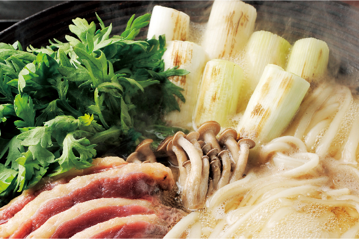 半田めんを鍋の〆に使用し、鴨旨味が凝縮されただし汁とともにお召し上がりください。