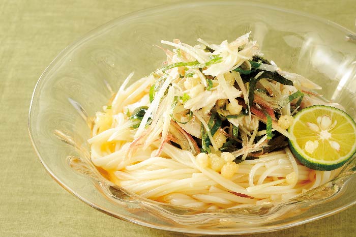 半田めんの喉ごしの良さに爽やかな具材が合わさり、さっぱりと食べ進められる一品です。