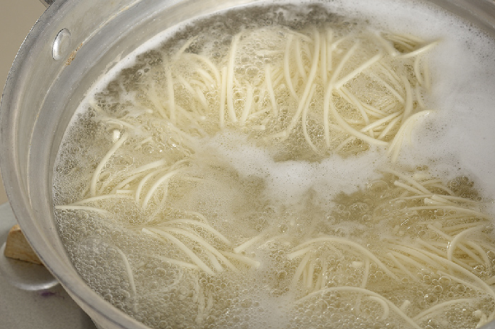 最初のポイントは、めんをゆでる際に、大きめの鍋にたっぷりのお湯を沸かすことです。