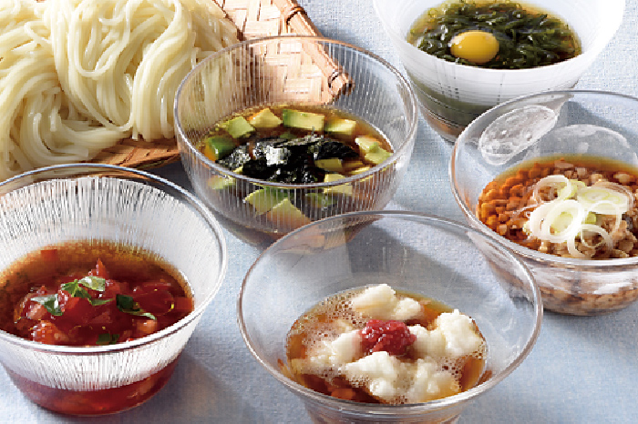 ストレートつゆに具材を加えるだけで楽しめる、5種類の変わりつゆそうめん。野菜や海藻も手軽に取り入れられ、さっぱりとしながら栄養バランスも整う、暑い季節にうれしいアレンジです。
