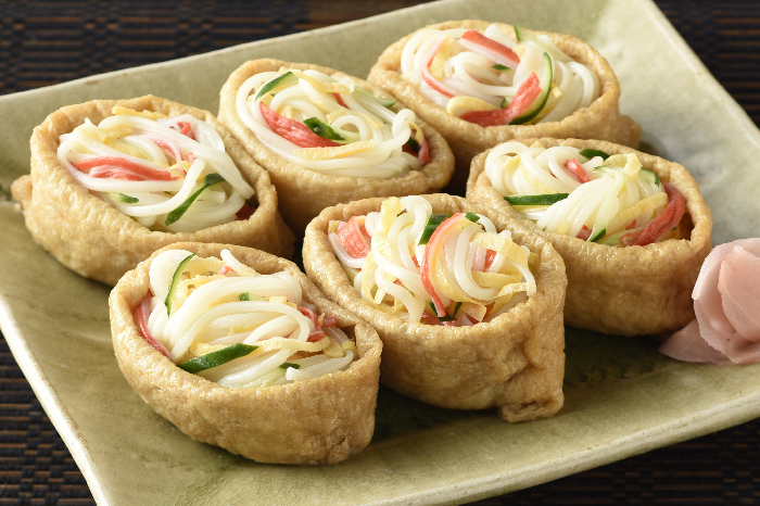 じゅわっ…と甘みのある味がよく染みこんだ油揚げに半田めん(半田そうめん)やカラフルな具材を詰めた見た目も可愛らしい「いなり寿司風そうめん」です。