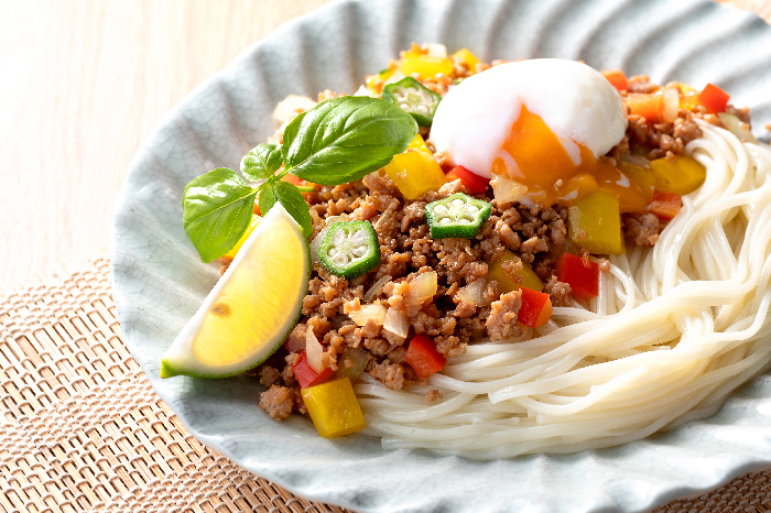 半田めん(半田そうめん)をエスニックなガパオライス風にアレンジしました。
