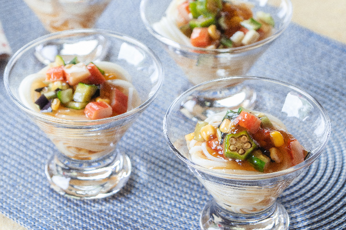 ガラスの器に盛り付けた、見た目にもお洒落な半田めん(半田そうめん)レシピは、おもてなしの一品としてぴったり。