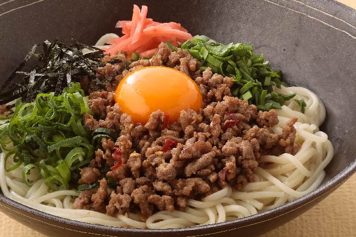 ひき肉に紅しょうが、九条ねぎ等の具材の上に卵黄をのせて、モチモチの半田めん(半田そうめん)とぐるぐると混ぜ合わせて召し上がれ♪食欲をそそるピリ辛の味付けに、オイスターソースが加わることで旨味がさらにアップ!ぜひお試しください。