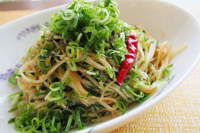 ねぎとしらすたっぷりのオイスターソース和え半田めん(半田そうめん)