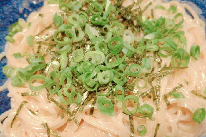 青ネギと刻みのりをトッピング!たらこパスタ風そうめん