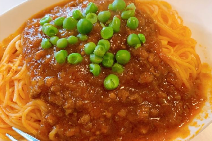 鮮やかな緑のグリーンピースをたっぷりのせて、見た目にも食欲をそそる甘辛いミートソースパスタ風そうめんに。