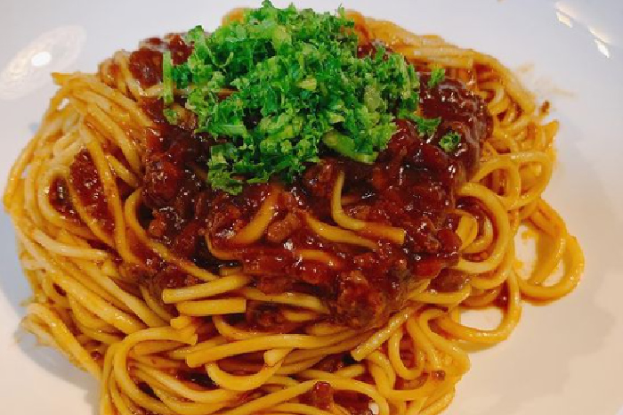 どことなく昭和レトロな喫茶店を想像させるミートソースパスタ風そうめん。
