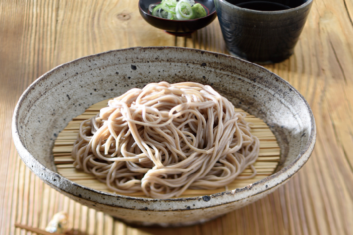 国内産の小麦粉にそば粉を練り込み、刃物を使わない手延べ製法で丁寧に作り上げた田舎風そばです。