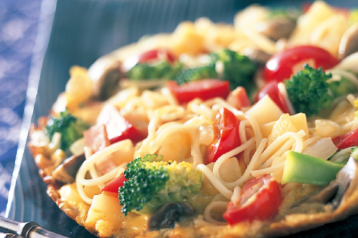 少量の余った半田めん(半田そうめん)を洋風レシピにリメイク!野菜もふんだんにつかった彩り豊かなオープンオムレツでテーブルも華やかに。