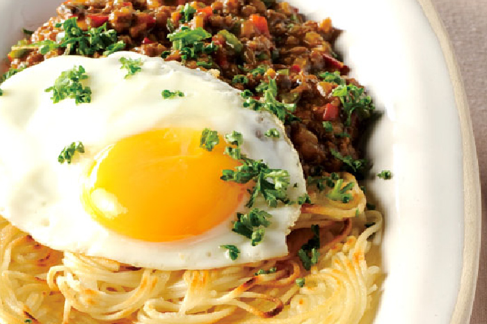 - 焼き上げた麺を器に盛り、その上にカレー炒めをかけます。仕上げに目玉焼きをのせ、パセリをふりかけたら完成です。*盛り付けの前に、麺に包丁で切れ目を入れておくと食べやすくなります。