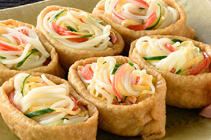 色鮮やかな見た目に食欲もわくいなり寿司風半田めん(半田そうめん)。