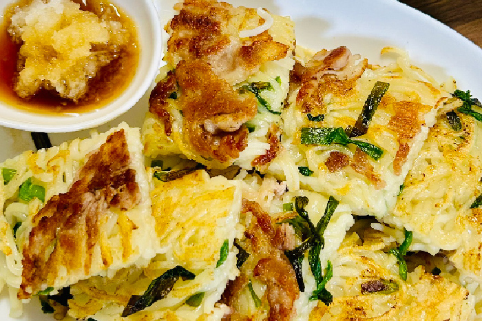 お酒のおつまみにもぴったりなチヂミ風半田めん(半田そうめん)。