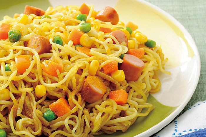 大人も子供も大好きなカレー味のチャンプルー風半田めん(半田そうめん)。