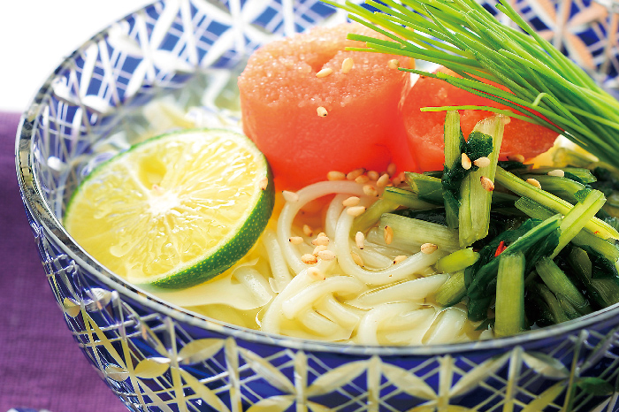 - 器に2の半田めんを盛り、1のつゆをかけます。たらこ、刻んだ壬生菜の漬け物、芽ねぎをのせ、仕上げに白ごまをふってすだちを添えれば完成です。具材はお好みでアレンジしていただけます。