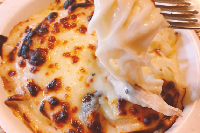 - グラタン皿に移し、上にチーズをお好みでトッピングしたら、約8分グリルで焼き焦げ目が付いたら完成です。