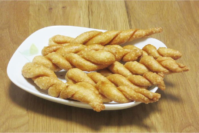 索餅は小麦粉を練った生地を縄のような形にして油で揚げたものです。