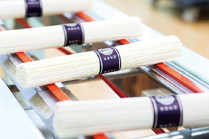 機械式は生地を薄く平たく伸ばし、細く切って仕上げるそうめんです。