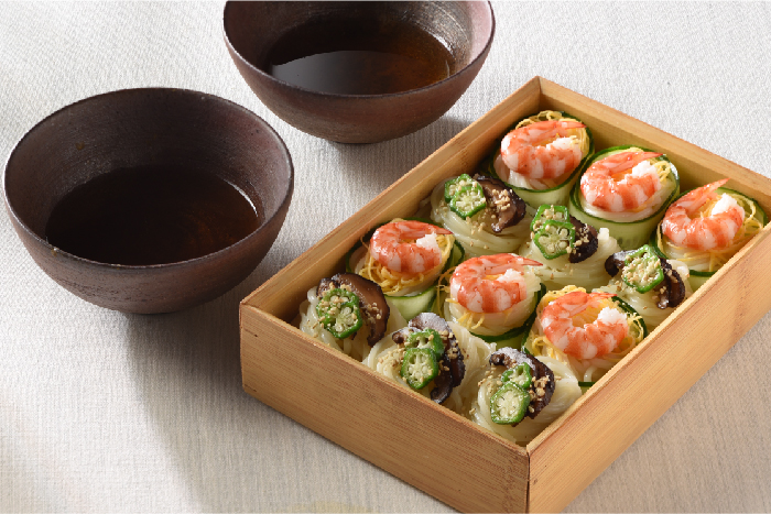 いなり寿司風そうめんは、錦糸たまごやカニカマをふんだんに使うことで、中身が映えるカラフルな彩り。