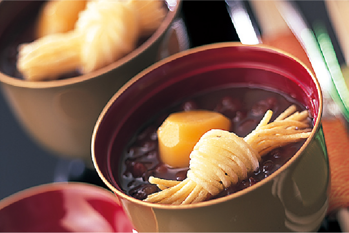 女の子の節句にふさわしく、リボン状に結んで揚げた半田めんを、甘いおしるに浮かべたデザート風。