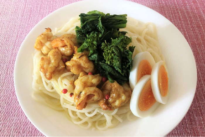 さらに今回は、春を感じるオリジナルレシピをご紹介します。春の食材と半田めんのどちらの美味しさも同時に楽しめ、10分ほどで完成するとっても手軽なメニュー。めんつゆでお浸しにした菜の花とカレー風味のえびがアクセントになり、どんどん箸の進むひと皿です。