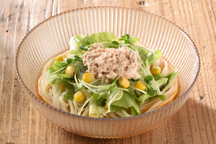 ツナマヨにレタスやキュウリなどの野菜を加えれば、シャキシャキな歯ごたえとそうめんの喉ごしが絶妙です。