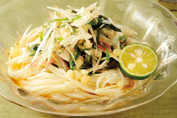 薬味の代表格であるみょうがと生姜、青じそに、鶏ささみやわかめ、揚げ玉を加えた「茗荷と生姜の冷やしめん」です。