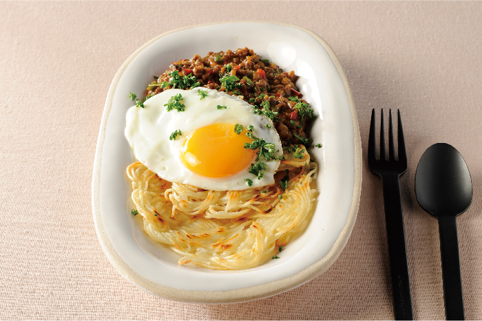 パリパリに焼いたそうめんにキーマカレーを乗せて、ご飯ともナンとも違う食感を楽しんでみてはいかがでしょうか。