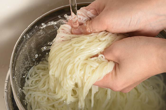 そうめんのくっつきを防ぐには、茹でたあとに冷水でよくもみ洗いすることが大切です。