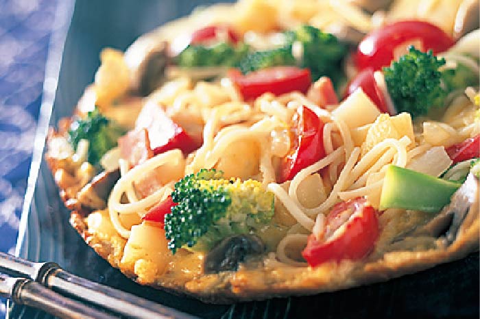 彩り野菜とそうめんを合わせたオープンオムレツは、祝日の食卓に華やかさをプラスしてくれます。