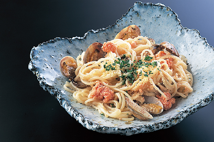 ニンニクと蒸したアサリを炒めたフライパンに、網で焼きほぐしたタラコと固めに茹でた半田めんを加え、こしょうで味付けをしてください。
