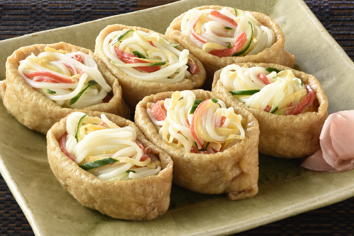 じゅわ…と染み出す油揚げの甘みにつるりと歯ごたえ抜群の半田めんが相性ばっちりのいなり寿司風そうめん。
