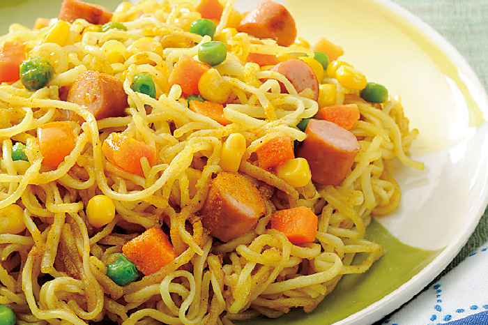 ウィンナーにミックスベジタブルでカラフルな具材とカレー色の麺が見た目にもワクワクします。