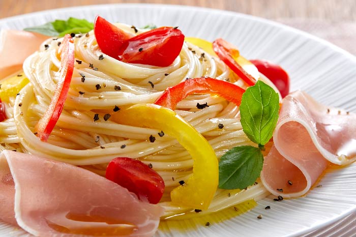 生ハムやトマト、パプリカを盛りつけた華やかなパスタ風半田そうめん。