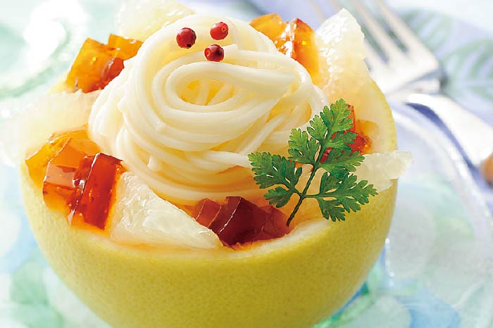 半田めんがデザートに変身!グレープフルーツの皮を器に使い、果肉の酸味と甘酢のジュレに半田めんを絡めて爽やかな味わいをお楽しみください。