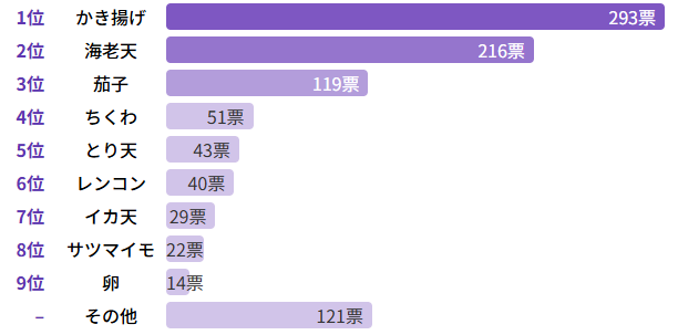 今回は「えび天」「かき揚げ」「さつま芋」「れんこん」「ちくわ」「とり天」「なす」「半熟卵」「いか天」「その他(自由選択)」の中からそうめんに合うと思う天ぷらのアンケートを実施しました。あなたの好きな天ぷらは何位でしょうか?